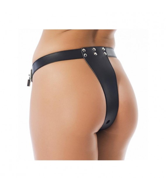 Arnés de castidad de cuero abierta por la entrepierna. Cuenta con un plug anal desmontable de 12 cm de largo y 3.5 cm de diámetro. Es ajustable gracias a las hebillas en las caderas con unos candados.