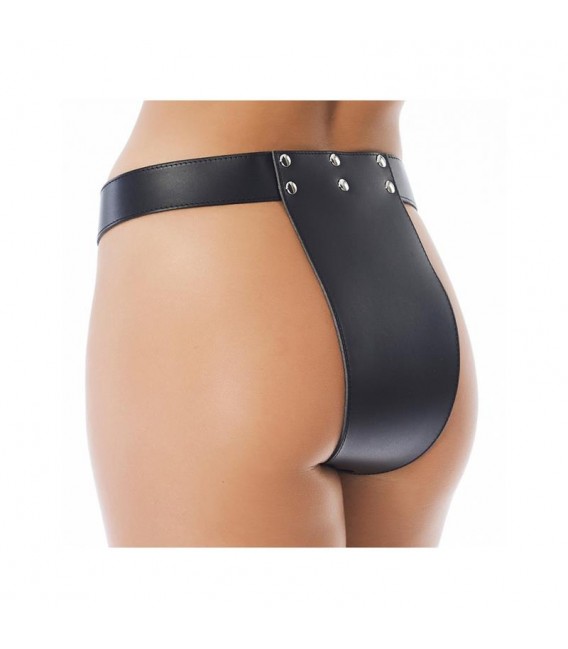 Arnés de castidad fabricado de cuero con dos orificios en la parte inferior y un candado en la parte delantera. Es totalmente ajustable gracias al cinturón con candado.