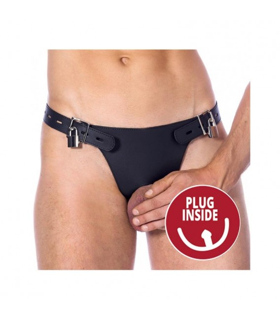 Cinturón de castidad fabricado de cuero con dos candados en las caderas para que lo puedas ajustar en 7 posiciones. Cuenta con una abertura en la entrepierna para poner los testículos y el pene. Pero además cuenta con un plug incorporado para doble diversión.