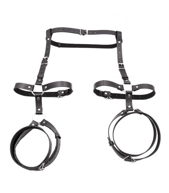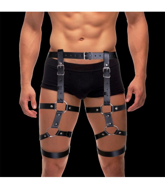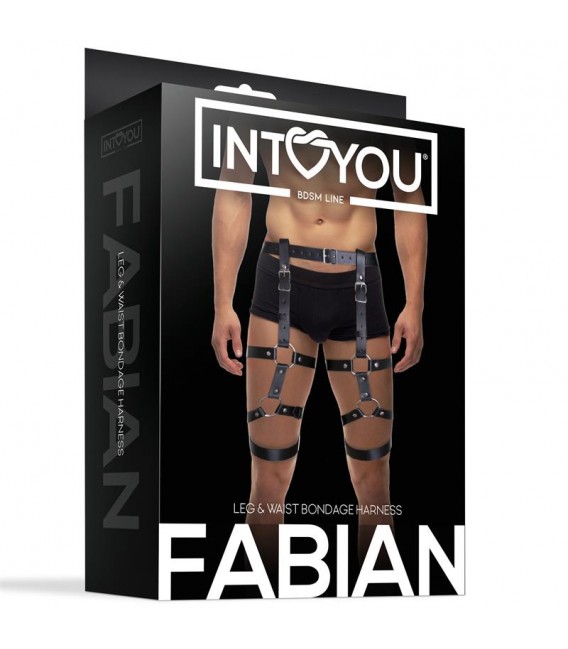 Fabian es un arnés de bondage para cintura y piernas. Cuenta con una correa para la cintura o cadera y dos correas que van por la parte delantera de las piernas. Estas últimas se ajustan a tus piernas con tres correas, una al muslo, otra por la parte superior de las rodillas y otra por la parte inferior.