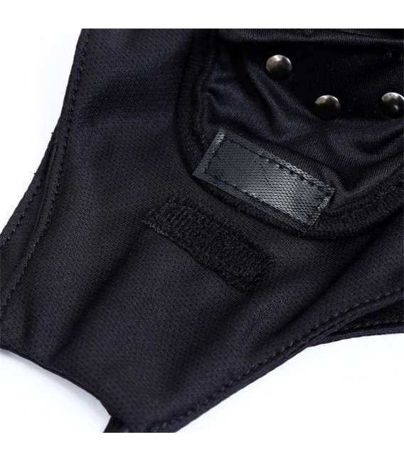Este artículo es muy peculiar, por fuera, es una mascarilla como otra cualquiera, negra con cordones ajustables. Pero nada más lejos de la realidad, ya que en cuenta con un accesorio que podrás colocar muy fácilmente con velcro. Este accesorio es, nada más y nada menos, un dildo que servirá como mordaza de manera muy sutil.