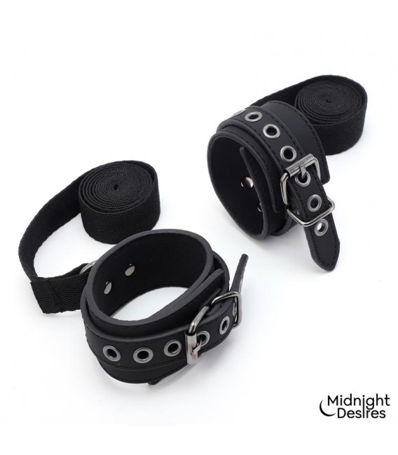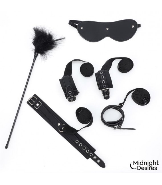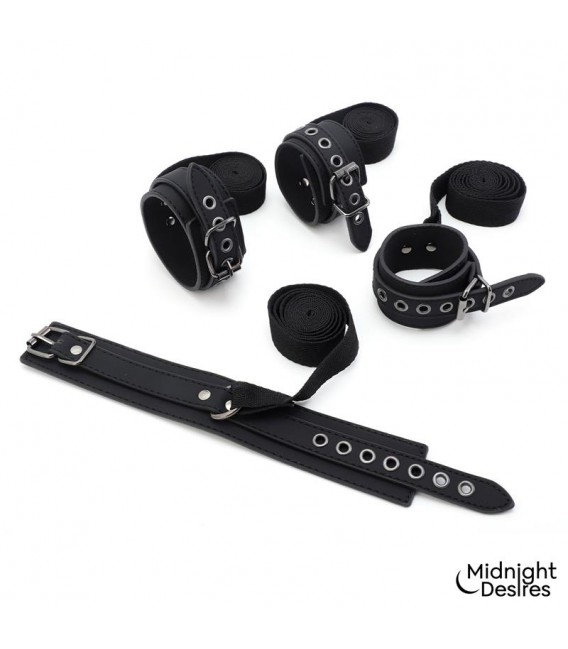 Todas las partes de este kit son en cuero vegano, con detalles elegantes. Las hebillas y los remaches en color plata le dan un toque de lo más erótico.