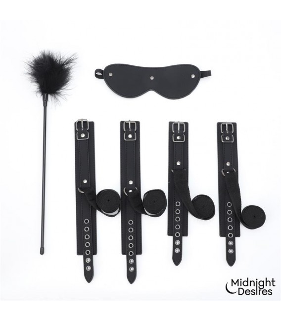 Este kit bondage es perfecto para aquellos que buscáis descubrir nuevos mundos de placer. En este kit llevas incluido un set de 4 esposas, dos para muñecas y dos para tobillos, una pluma estimuladora y un antifaz. Las esposas son muy especiales, por una parte, son ajustables con hebillas, y por la otra cuentan con una larga tira, ideada para que puedas atar a tu sumiso/a a cualquier silla o asiento.