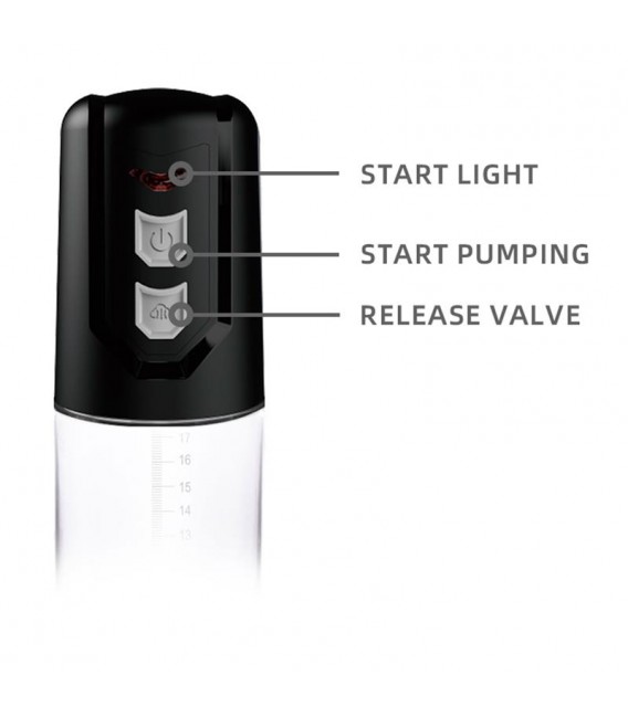 La bomba PSX10 cuenta con un cilindro transparente con medidor, ideal para comprobar como tu pene va creciendo con cada embestida. Esta bomba es automática, cuenta con un botón para comenzar con una presión más ligera, otro botón para aumentar la presión, y otro para liberar la presión de maneras rápida.