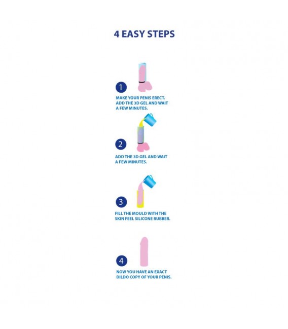 La simplicidad de este kit hace posible la creación de tu dildo en solamente 3 pasos consiguiendo un resultado perfecto cada vez. Contiene 2 bolsas de nuestro gel 3D y un anillo para el pene para que puedas mantener la erección mientras se realiza el moldeado y una funda para que la uses con tu recientemente estrenado dildo.