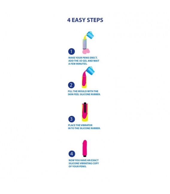 La simplicidad de este kit hace posible la creación de tu dildo en solamente 3 pasos consiguiendo un resultado perfecto cada vez. Contiene 2 bolsas de nuestro gel 3D y un anillo para el pene para que puedas mantener la erección mientras se realiza el moldeado.