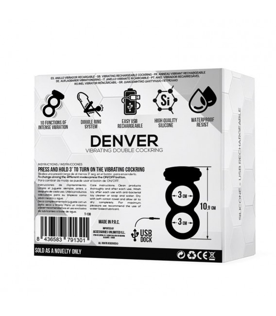 Y pensarás, un anillo con bala más en el mercado? nada más lejos de la realidad. Denver es un anillo doble si con bala vibradora sí, pero con una bala vibradora con nada más y nada menos que 10 funciones de vibración, y no es una bala cualquiera, sino que es recargable por USB. Lo más novedoso del mercado te lo traemos solo para ti.