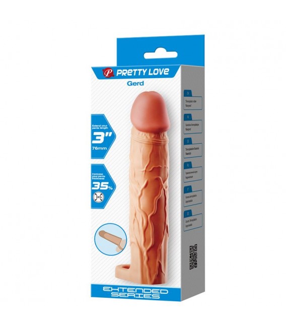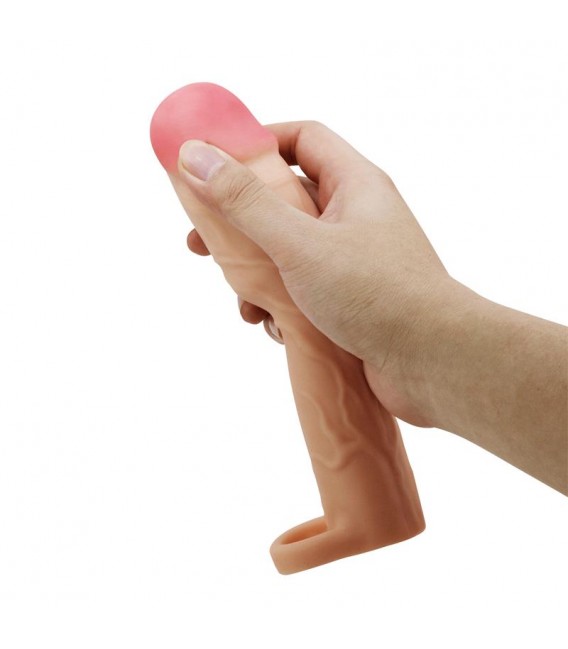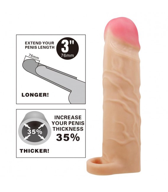 Lleva el placer de tu pareja al siguiente nivel con esta funda para pene que aumenta la longitud y el grosor. Ofrece 3 pulgada extra de longitud y un incremento en el diámetro, mientras que su material de textura realista y detalles naturales crean una sensación de llenado auténtico. Diseñada para ajustarse cómodamente al pene del usuario, mejora el control y ayuda a retrasar la eyaculación. Su canal interno suave garantiza una experiencia cómoda y placentera. No olvides aplicar lubricante a base de agua tanto en el interior como en el exterior antes de usarla.