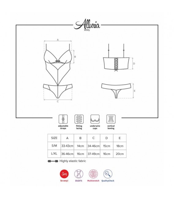 Materiales suaves y sedosos en un diseño que no te dejará indiferente. Este body cuenta con una parte de arriba poco tradicional, la parte del busto cuenta con un sujetador con aros que se une al cuerpo del body solo en la mitad, dejando tus caderas expuestas. La espalda la tendrás casi por completo descubierta y podrás ajustarlo gracias a su cierre con lazos. La zona del cuerpo se une a la braguita con una sensual tira.
