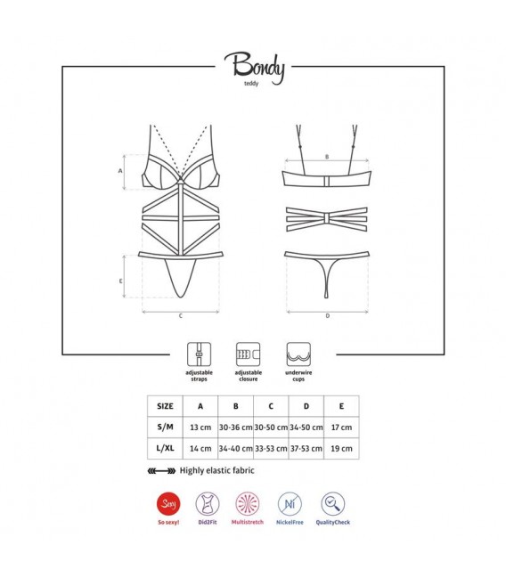 Sensual body de malla semi transparente con una variedad de tiras que abrazan tu cuerpo. Cuenta con tirantes ajustables y un elegante collar que va desde el pecho hasta el cuello.