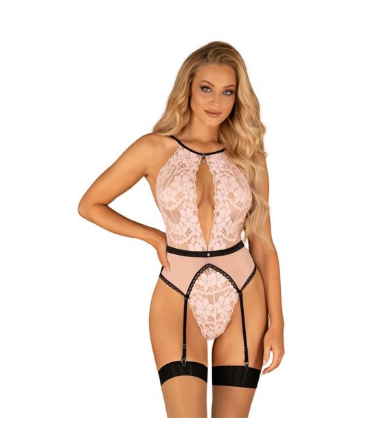 Elegante y sensual teddy de color rosa palo junto con negro. con un duo de patrones en encaje y raso, este teddy será tu favorito.