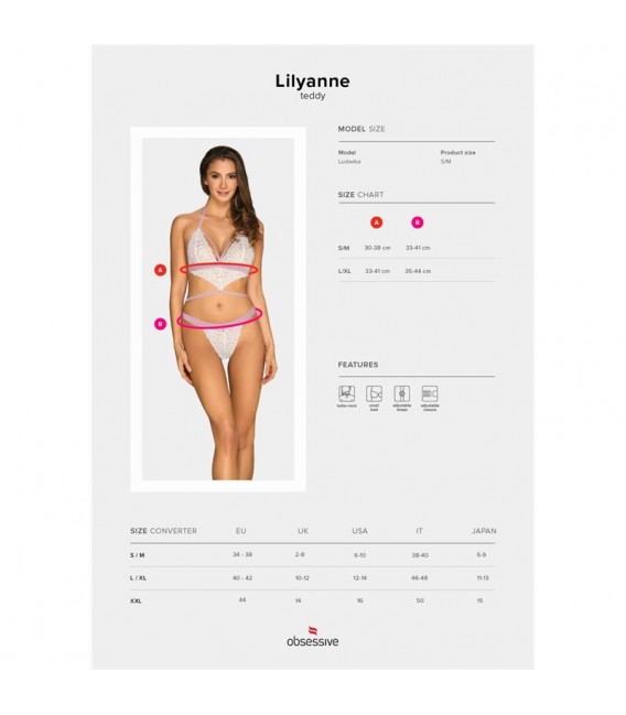 ¡Siéntete segura y sexy con este provocativo body de Lilyanne! Este body cuenta con líneas divertidas, hermoso encaje en color blanco y detalles llamativos. El material elástico garantiza una gran comodidad de uso.