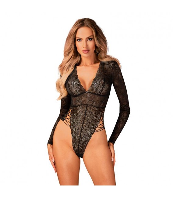 Elegante y sensual teddy de manga larga de la línea Merlys. Cuenta con una entre pierna alta, con una serie de tiras en las caderas para enfatizar tus curvas.