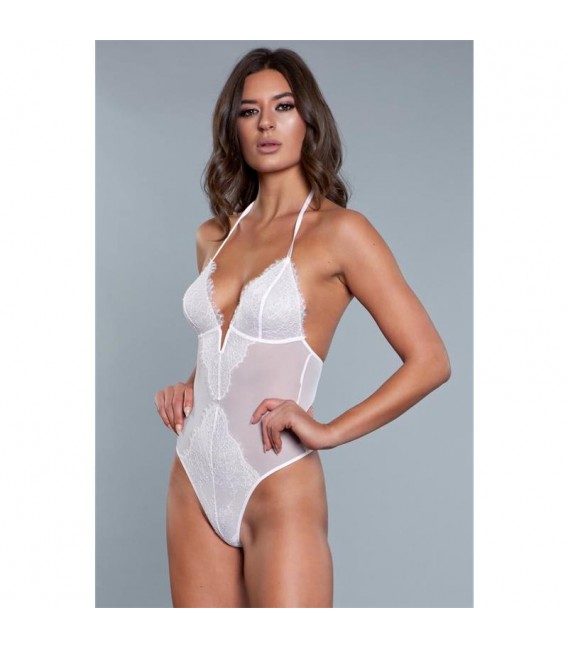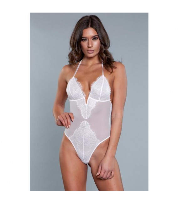 Un body de encaje semi transparente con un patrón mixto. En la parte de las caderas y en la espalda un encaje semi transparente blanco, y en la zona del pecho y entre pierna un patrón de flores de u blanco más opaco. Con unos tirantes atados al cuello cuenta con una espalda totalmente abierta y una parte trasera de tanga.