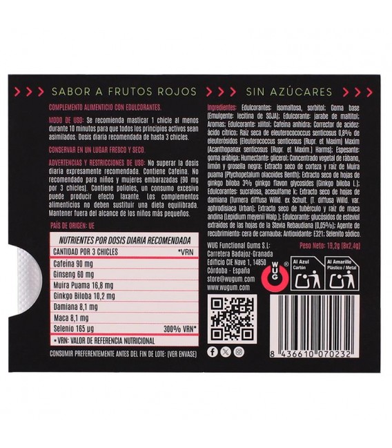 No recomendado para niños ni mujeres embarazadas. No superar la dosis diaria expresamente recomendada. Contiene cafeína. Contiene polioles, un consumo excesivo puede producir efectos laxantes. Los complementos alimenticios no deben sustituir una dieta equilibrada. Mantener fuera del alcance de los niños más pequeños.