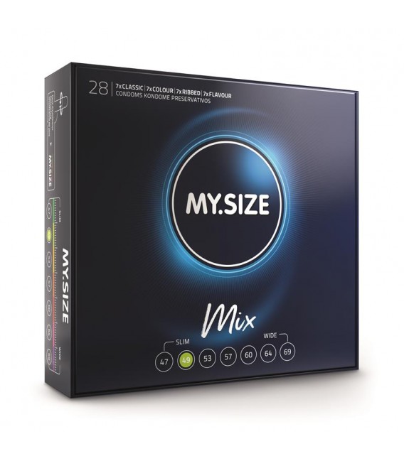 Descubre el My Size Mix Talla 49, una selección de 28 preservativos variados, incluyendo naturales, estriados, de color y con sabor a fresa. Diseñados para un ajuste perfecto y una sensibilidad mejorada, estos preservativos de látex natural VYTEX minimizan los alérgenos, asegurando seguridad y placer en cada momento íntimo.