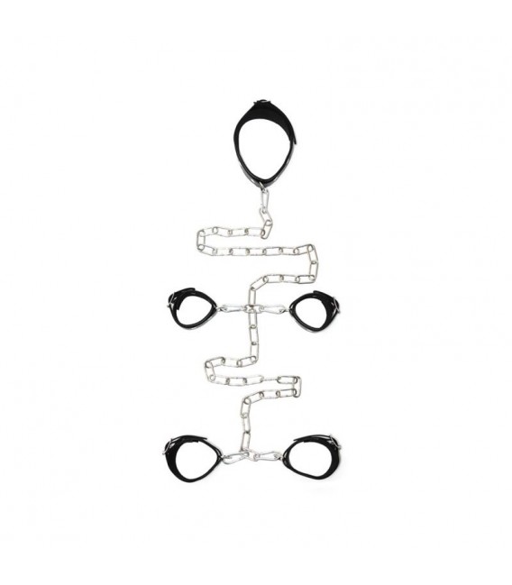 Ataduras de cuello, manos y pies, con 5 mosquetones y una cadena de metal. Perfecto para noches de BDSM sin límite.