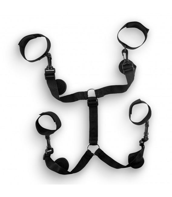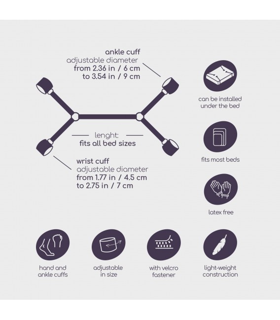 Ate a su amante y téngalo a su gusto, vulnerable a cada caricia. Ríndase al bondage y explore nuevas emociones. Características principales:· Talla universal, sirve en la mayoría de las camas· Esposas ajustables· Para usar en pareja· Restricciones ajustables al colchón· Material: Nailon, Velcro