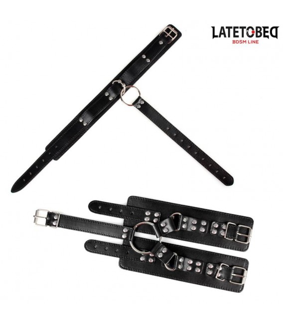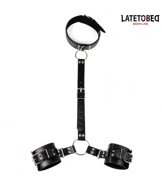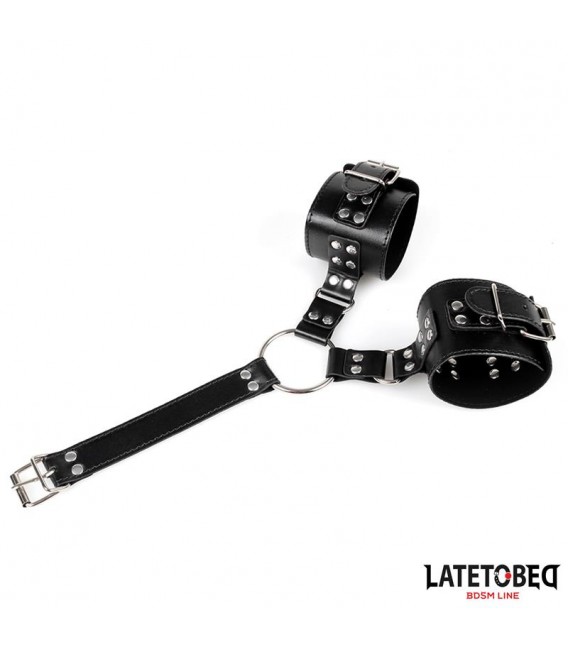 Disfruta siendo el/la que manda o el sumiso/a con estas restricciones que cuentan con un collar ajustable con hebilla unido con una tira, también ajustable con hebilla, y a unas esposas para las muñecas unidas entre sí. Es perfecto para que tu sumiso/a no pueda mover las manos y tu tengas el poder.