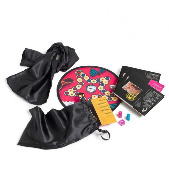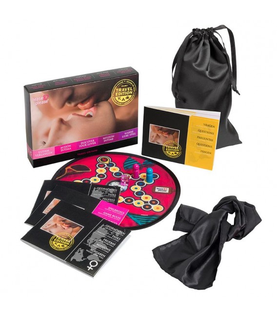 Para agregar un toque picante a esta edición de viajes, ahora también incluye una bufanda sutilmente transparente que se puede usar como un taparrabos, como una venda para tapar los ojos o para atar de manera más atrevida. Si después de jugar el juego deseas relajarte de otra manera puedes usar el tablero de juego como un Frisbee. Usando su propia y hermosa bolsa de viaje de raso, puedes llevarla contigo con facilidad y discretamente, ¡solo para agregar ese poco de erotismo y completar tus vacaciones!