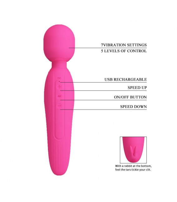 Con 7 configuraciones de vibración para elegir 5 niveles de intensidad este masajeador de varita facilita una estimulación personalizada. Cuenta además con un par de orejas de conejo que son ideales para la estimulación del clítoris. Encuentra el lugar perfecto a medida que el cuello flexible se adapta a la forma de tu cuerpo.