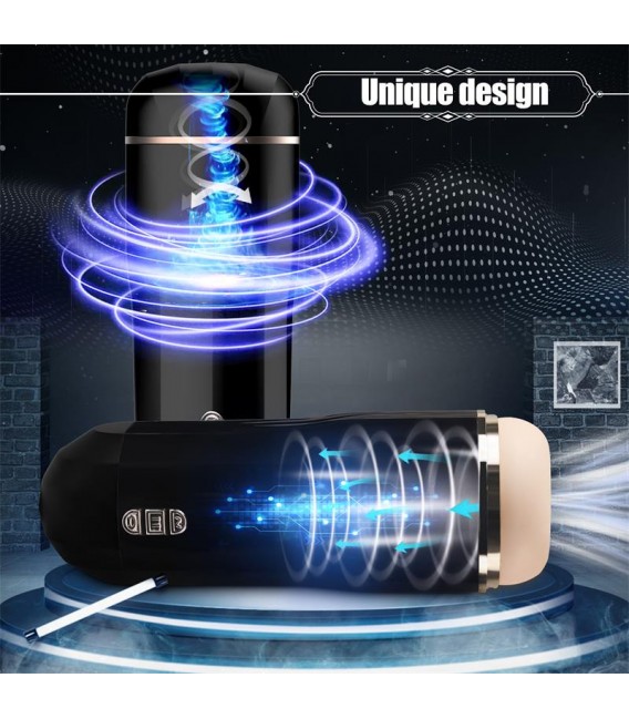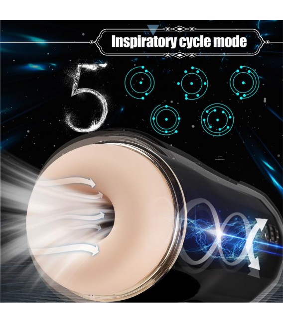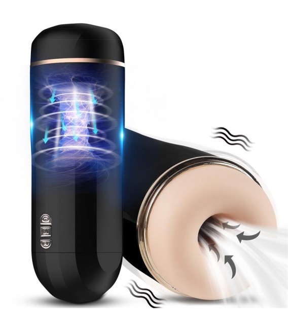 Masturbador masculino con 7 patrones de vibración y 5 potentes modos de succión. Cuenta con una abertura redonda con un canal texturizado con un diseño futurista.