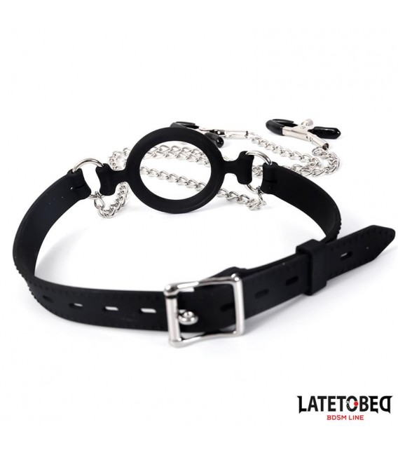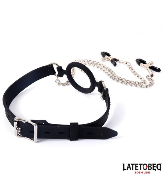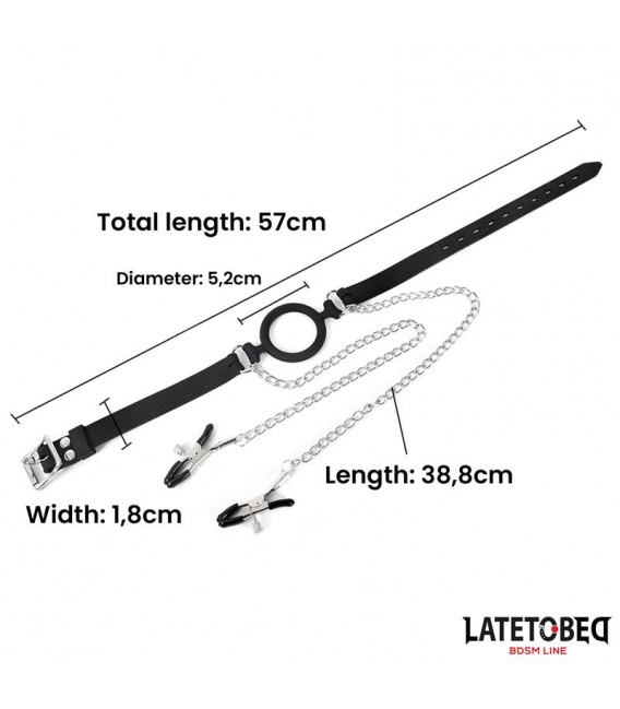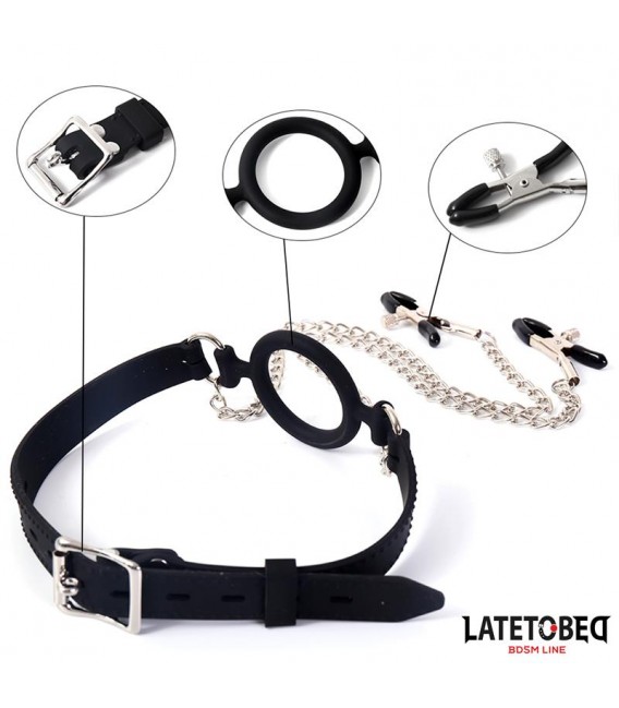 Esta mordaza de aro es totalmente ajustable gracias a su correa con hebilla. Junto con ella encontrarás unas pintas para pezones recubiertas para mayor comodidad y seguridad.