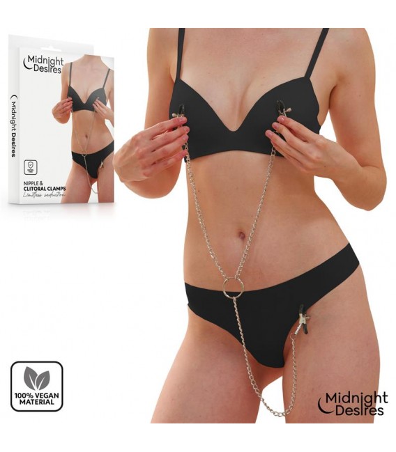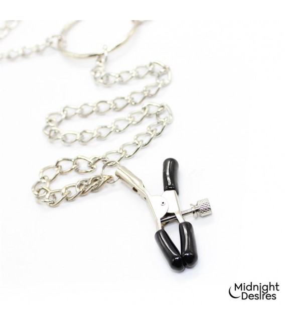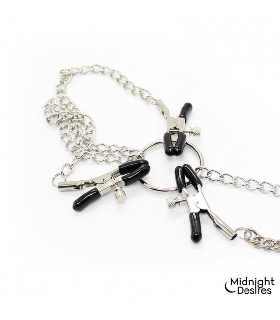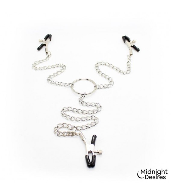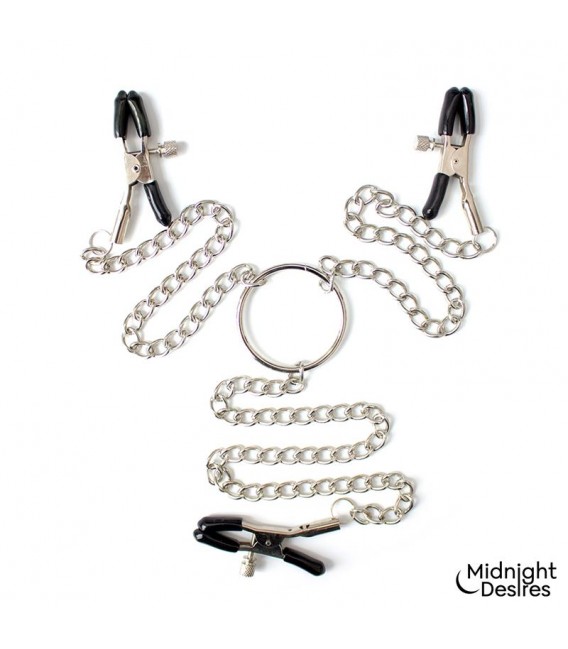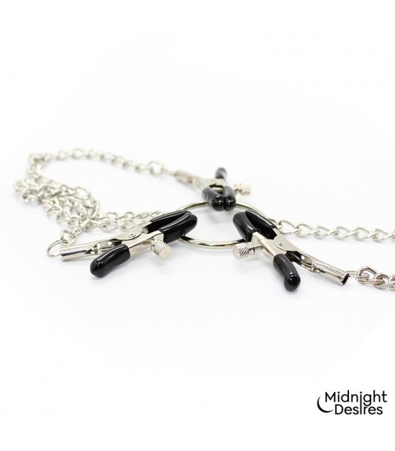 ¿Quieres experimentar el placer real? Prueba este set con pinzas para pezones y clítoris. Estas pinzas van unidas con una cadena, lo que es ideal para añadir un toque extra de diversión a vuestros encuentros, y las pinzas son clásicas y ajustables.