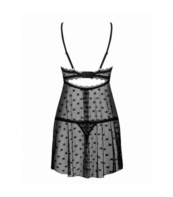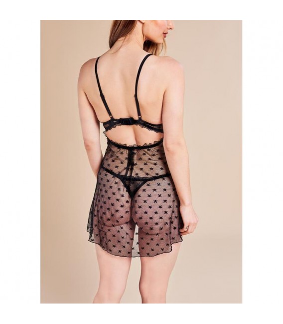 Picardías semi transparente con estampado de estrellas y tirantes ajustables. El tanga a juego complementa este look y el material elástico proporciona una gran comodidad.
