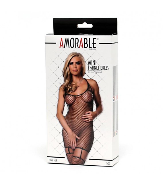 Un mini vestido de rejilla elástica con varias sorpresas. Cuenta con una espalda semi descubierta, con los tirantes unidos al centro de la espalda y con unos ligueros fijos.