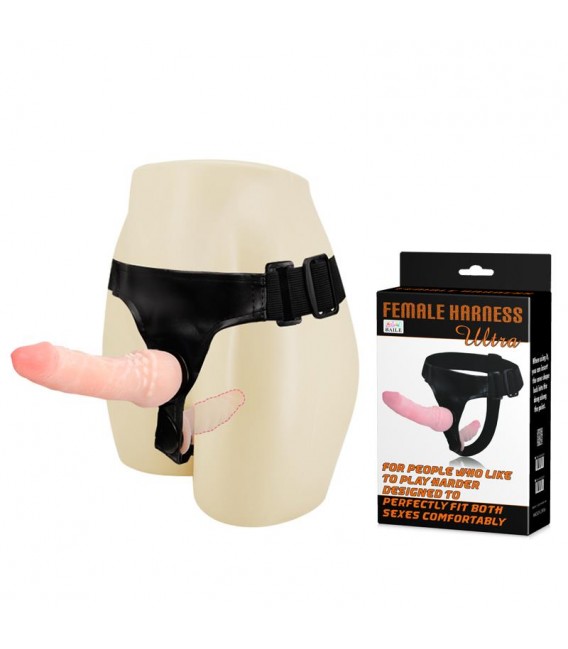 El Arnés Ultra Doble Penetración Natural está diseñado para duplicar el placer y aumentar la conexión entre quien lo lleva y su pareja. Consta de dos dildos: uno interno de 11cm × 4cm, que se introduce para estimular a quien porta el arnés, y otro externo de 16,5cm × 3,5cm, que penetra a la pareja. Ambos cuentan con un diseño cuidadosamente estriado para intensificar las sensaciones en cada movimiento.