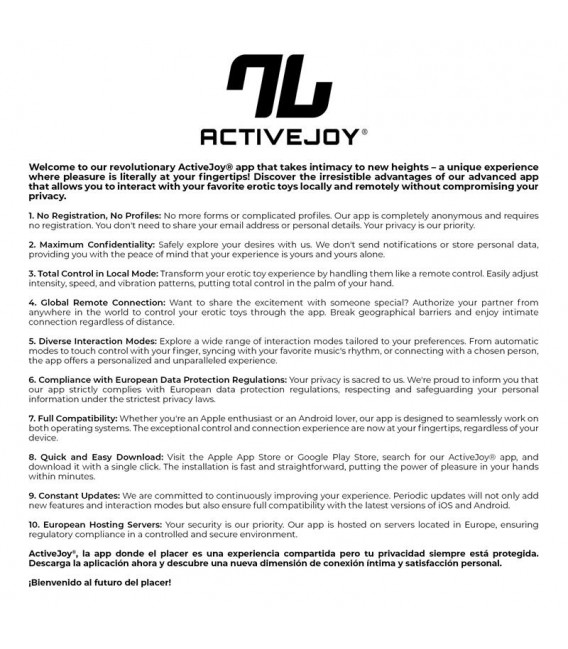 Con su APP ActiveJoy®, controlas las vibraciones a cualquier distancia, rompiendo barreras físicas y ofreciendo una nueva dimensión en juegos de pareja. Su diseño en silicona doble capa proporciona una textura suave y agradable, asegurando una inserción cómoda y segura.