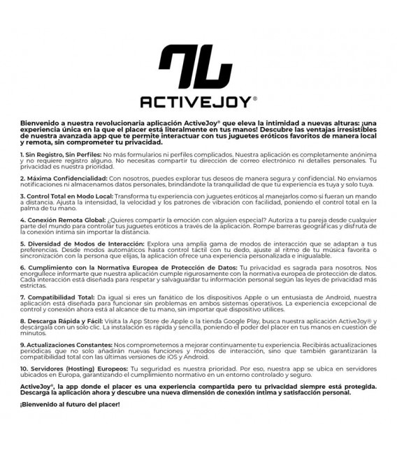ActiveJoy®, la app donde el placer es una experiencia compartida pero tu privacidad siempre está protegida. Descarga la aplicación ahora y descubre una nueva dimensión de conexión íntima y satisfacción personal.