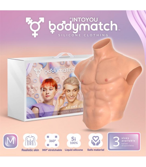 Boomax es un traje de músculos híper realista fabricado de silicona líquida. Este traje cuenta con rasgos masculinos bien marcados, con pezones, pectorales y abdominales realistas y suaves al tacto.
