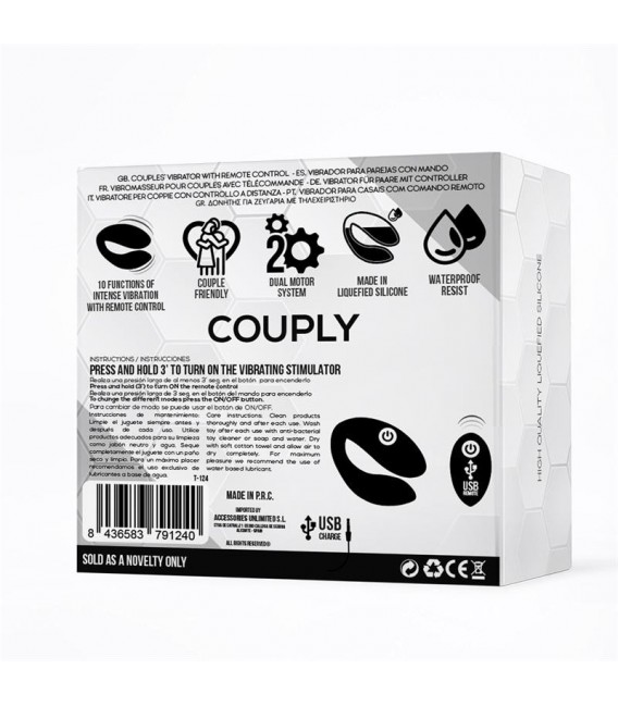 Couply es de sistema dual, es decir, tiene embebidos dos potentes motores con los que podréis disfrutar de 10 funciones de vibración, intensas, maravillosas, placenteras. Para que no te tengas que preocupar, Couply incluye un control remoto inalámbrico, podrás cambiar de intensidad cuando y donde quieras, o dale el control remoto a tu pareja para dejarte llevar.