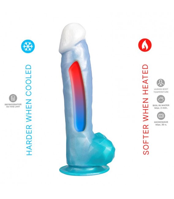 KEY POINTS: Dildo realista de 8 pulgadas con tecnología termoreactiva. Caliéntalo para suavidad o enfríalo para firmeza - tú mandas. Silicona líquida con núcleo de SILEXPAN. Longitud insertable de 15cm para placer profundo. Peso de 393g para sensación sólida y auténtica. Textura realista con venas muy agradable al tacto. Parte superior realista y base con acabado de fantasía. Base con ventosa de 70mm para manos libres. Color azul perlado único. Perfecto para explorar nuevas sensaciones.