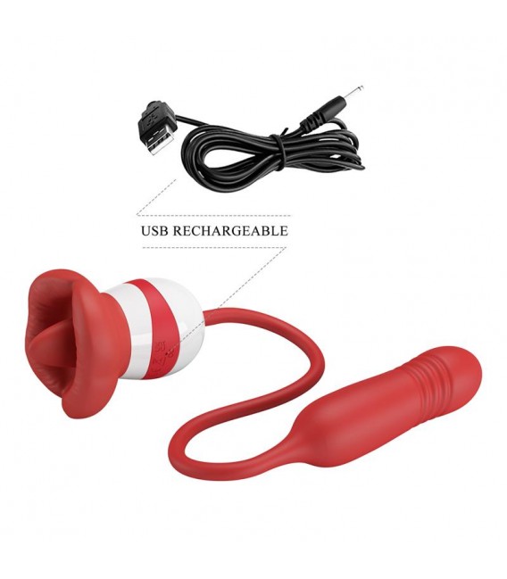 Este vibrador cuenta con dos funciones bien marcadas, en un extremo una zona con forma de boca, y en la otra una bala vibradora con movimientos de empuje. La parte de la lengua se mueve hacia arriba y hacia abajo, mientras que la bala vibradora cuenta con 5 funciones de movimiento thrusting.
